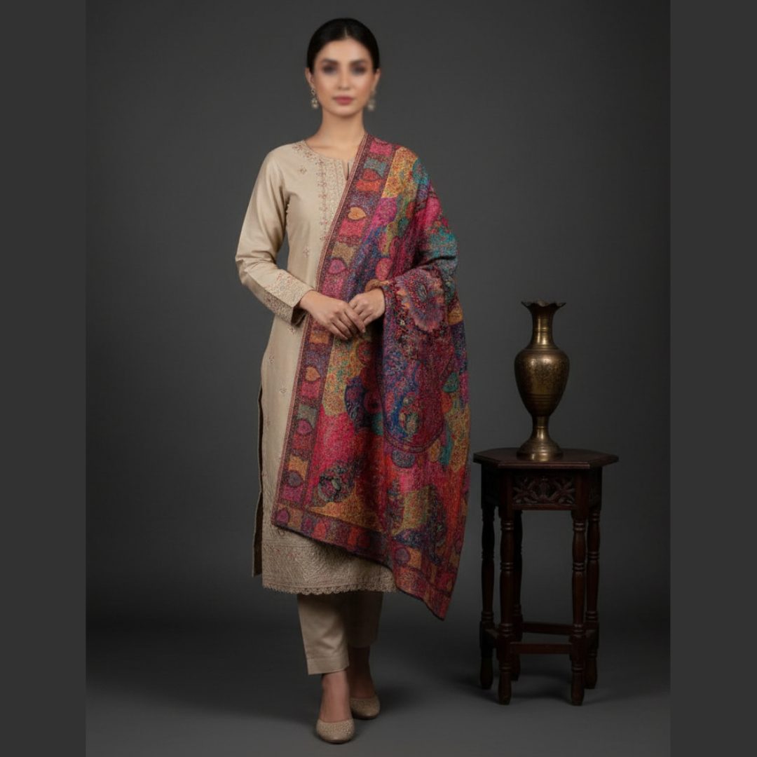 Bahaar-e-Noor – Pashmina Shawl reflects a celebration of color and craftsmanship. Its multi-color Moonlight embroidery dances across the soft and luxurious Pashmina fabric, creating a masterpiece of heritage and grace.