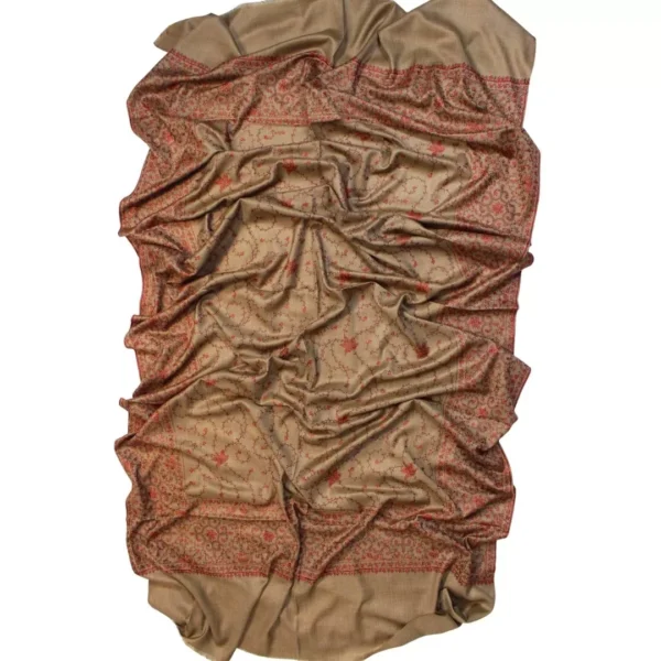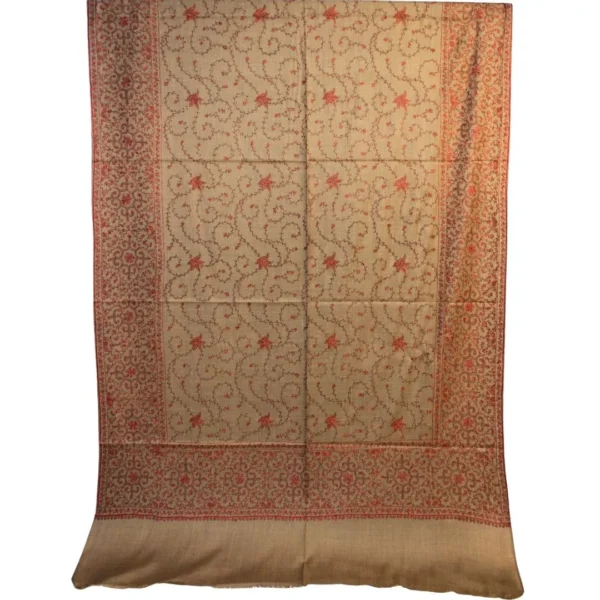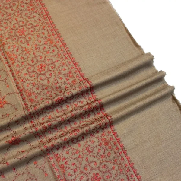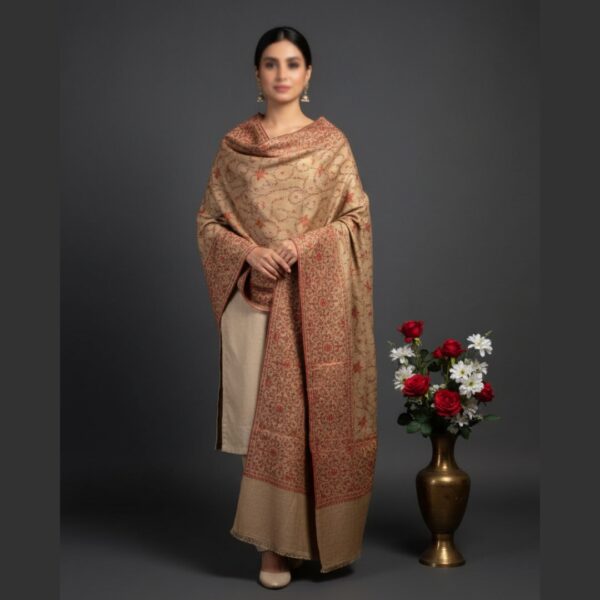 In the gentle tone of earthy beige, this Pashmina Shawl unfolds the story of Kashmiri artistry and timeless tradition. Woven from the finest pashmina and adorned with hand-done sui embroidery, its floral patterns flow gracefully across the fabric, creating a sense of rhythm and calm.