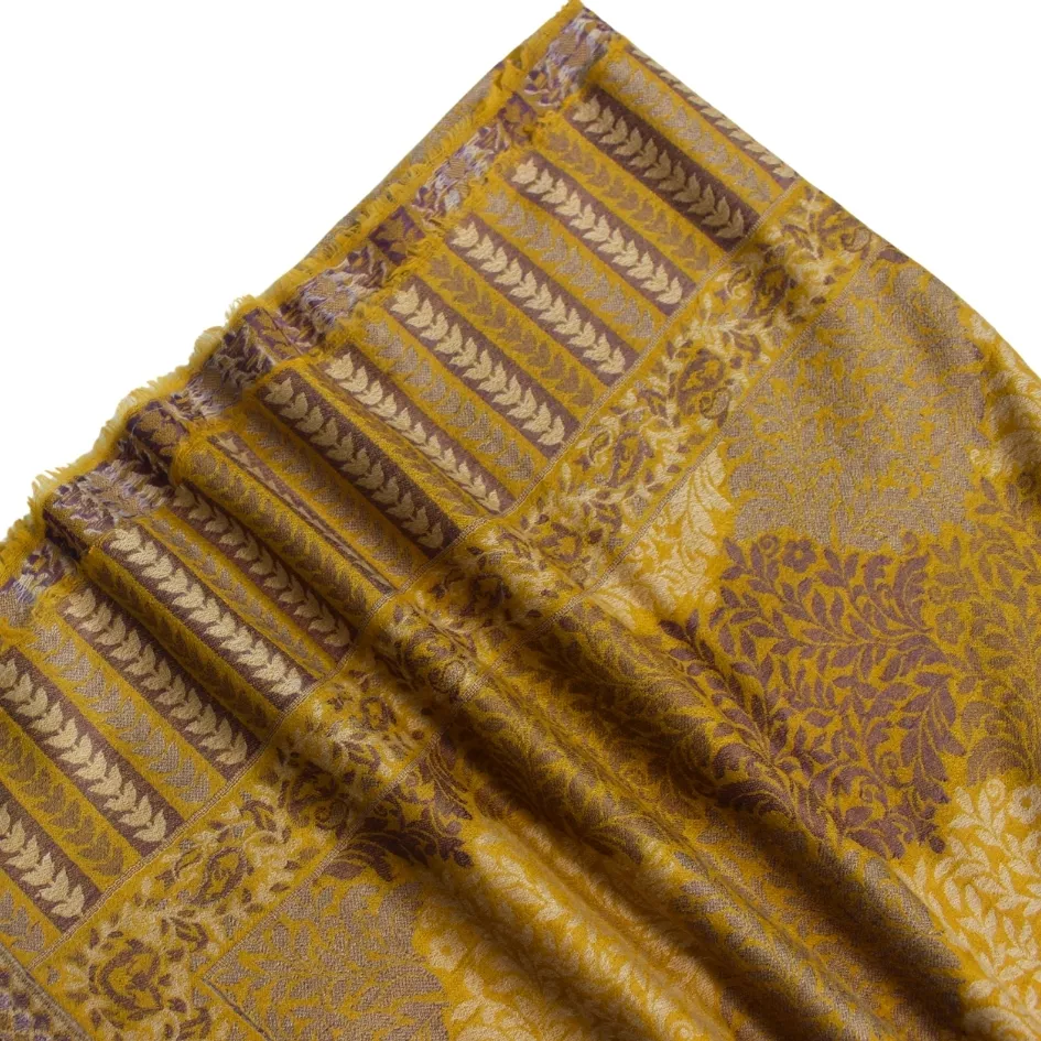 This hand-woven pashmina shawl features a rich mustard base beautifully enhanced with intricate floral Kani work, woven with precision and patience by skilled artisans. The floral motifs flow harmoniously across the fabric, celebrating nature-inspired design rooted in centuries-old tradition. Crafted from premium pashmina, the shawl is lightweight, breathable, and naturally warm, offering an elegant drape with lasting comfort. Measuring 2.5 yards in length and 1.5 yards in width, this piece reflects refined craftsmanship and understated luxury. To preserve its beauty, dry clean only, store in breathable fabric, and avoid moisture and direct sunlight.
