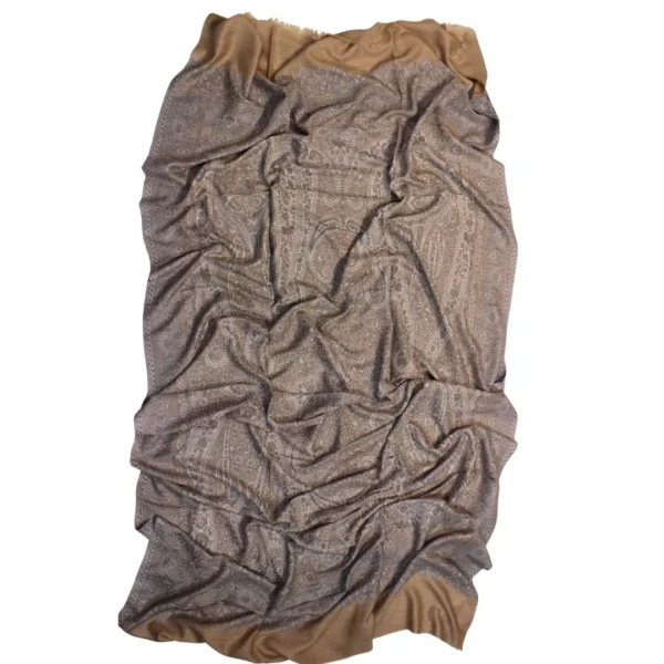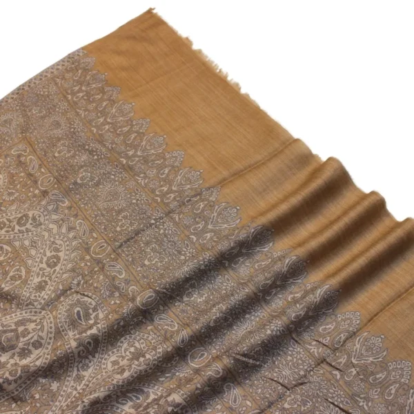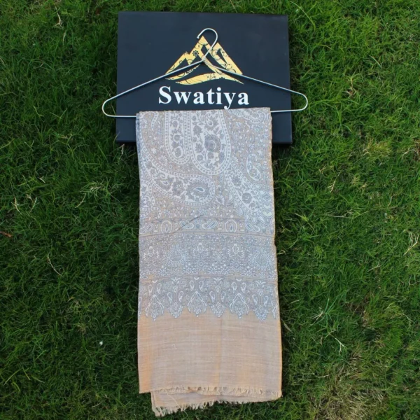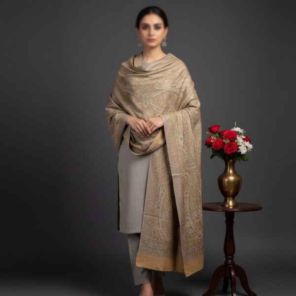 In the soothing warmth of beige, this Pashmina Shawl celebrates the centuries-old art of Kaani embroidery, a technique deeply rooted in the valleys of Kashmir. Each motif is woven with intricate precision, creating soft floral and vine patterns that flow gracefully across the surface.