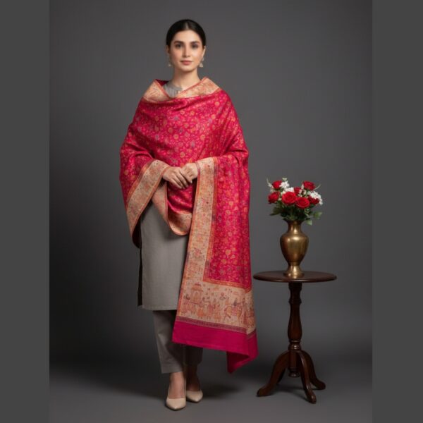 The piece embodies Kashmir’s most refined artistry, brought to life by skilled women artisans who preserve this legacy through patience and devotion. Crafted from pure, feather-light pashmina, it offers warmth without weight, elegance without effort — a shawl that feels as graceful as moonlight on silk.