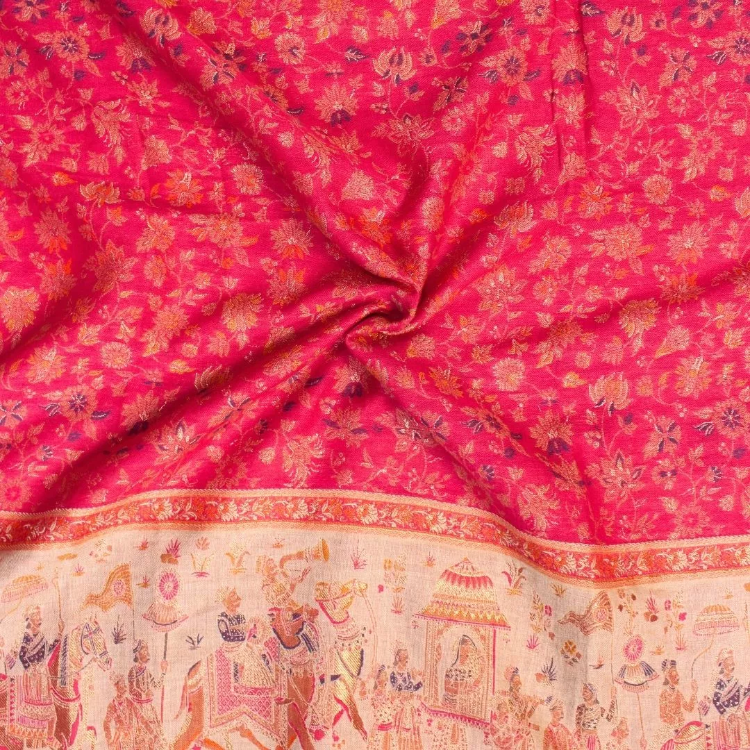Wrapped in a gentle blush pink base, this Pashmina Shawl shines with two timeless arts — Kaani weaving and Moonlight embroidery. Together, they create a symphony of texture and light, where intricate woven motifs meet delicate embroidered highlights that shimmer softly against the fabric.