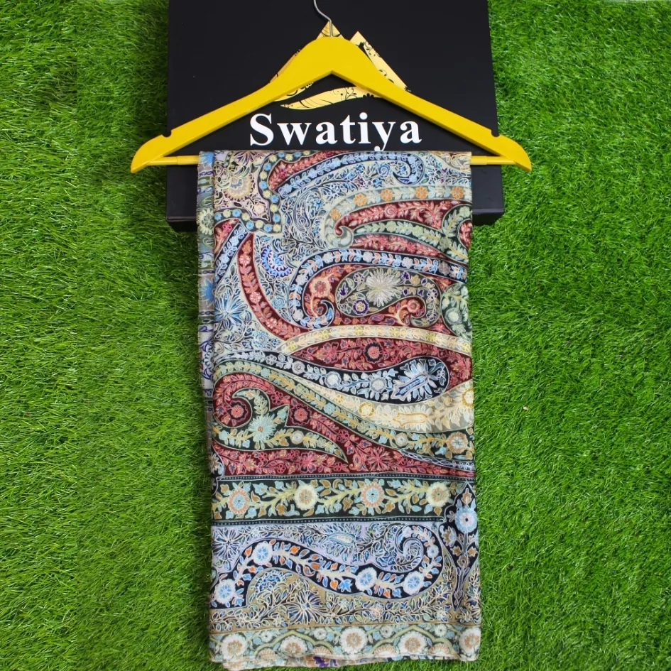 This Qalam Kaar shawl is created on a hand-painted fabric, following the traditional artistry where each motif is carefully painted by hand, allowing the colors to flow naturally across the surface. The artwork is subtly elevated with fine hand embroidery, adding dimension and refined detail to the composition. Crafted by skilled women artisans, every shawl carries unique nuances that reflect its handcrafted origin. Lightweight, breathable, and fluid in movement, this piece offers an elegant drape and a timeless presence. Measuring 2.5 yards in length and 1.5 yards in width, it stands as a sophisticated expression of wearable heritage art.