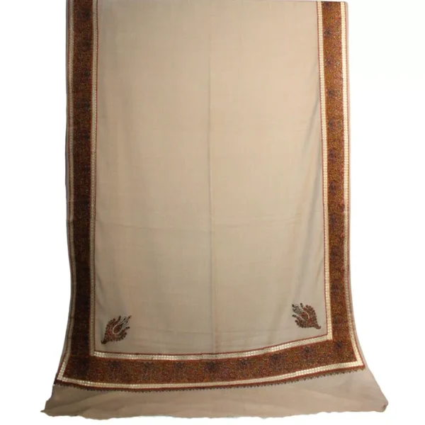 An elegant beige Pashmina Shawl bordered on all four sides with intricate embroidery, a timeless piece that whispers the grace of Kashmiri artistry.