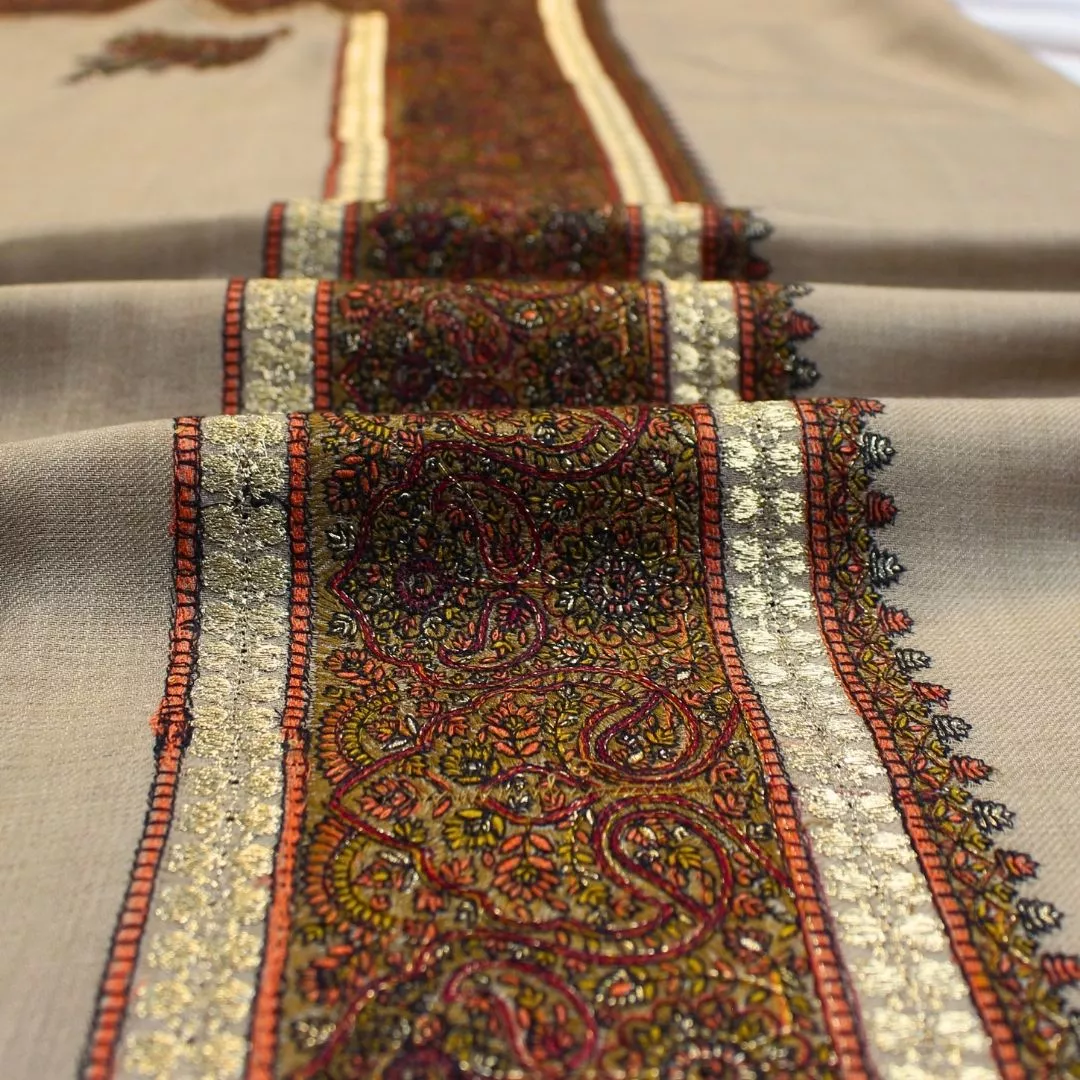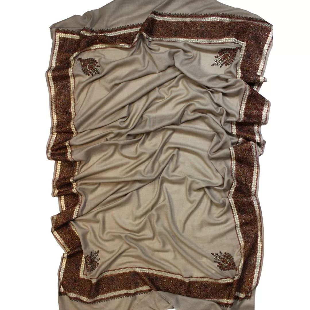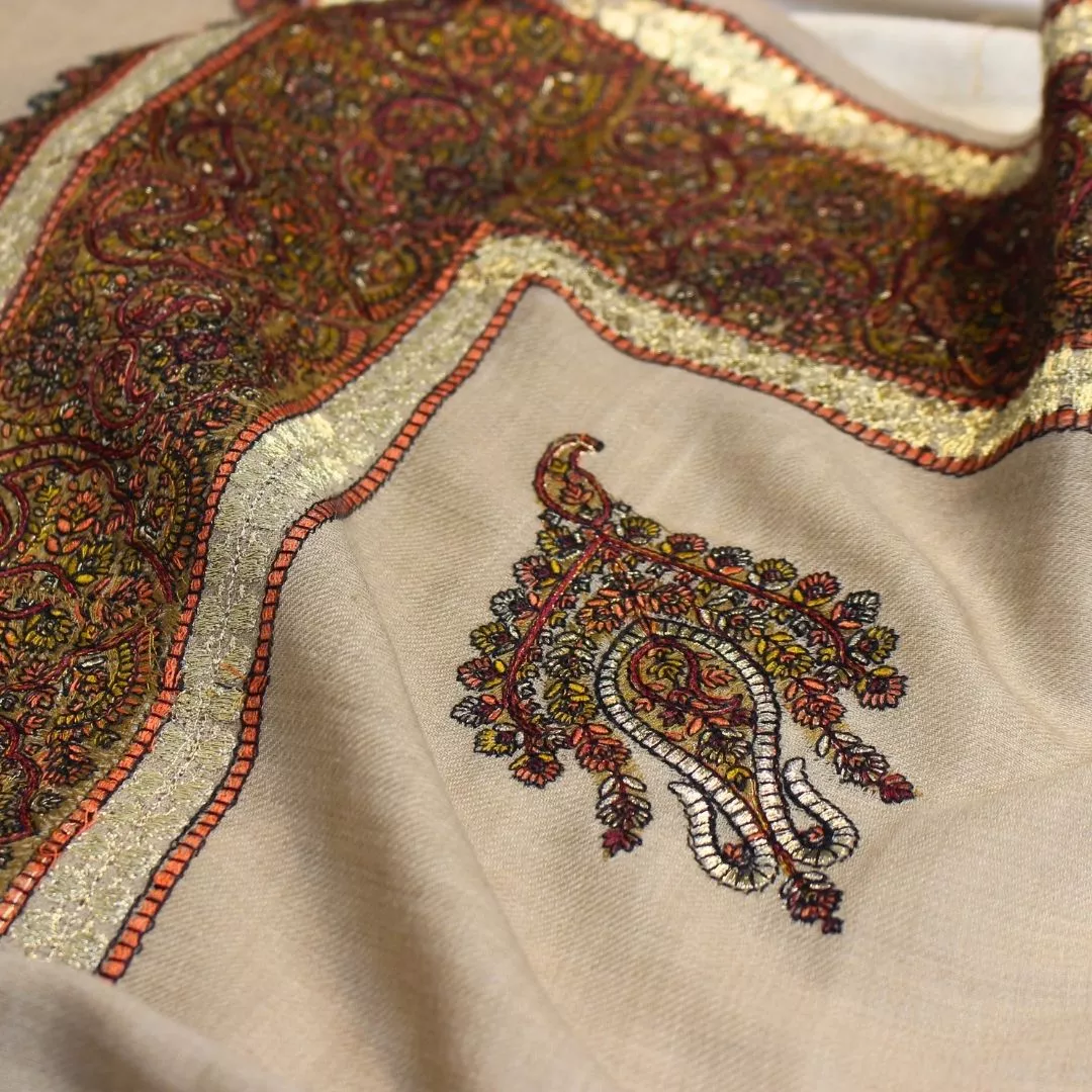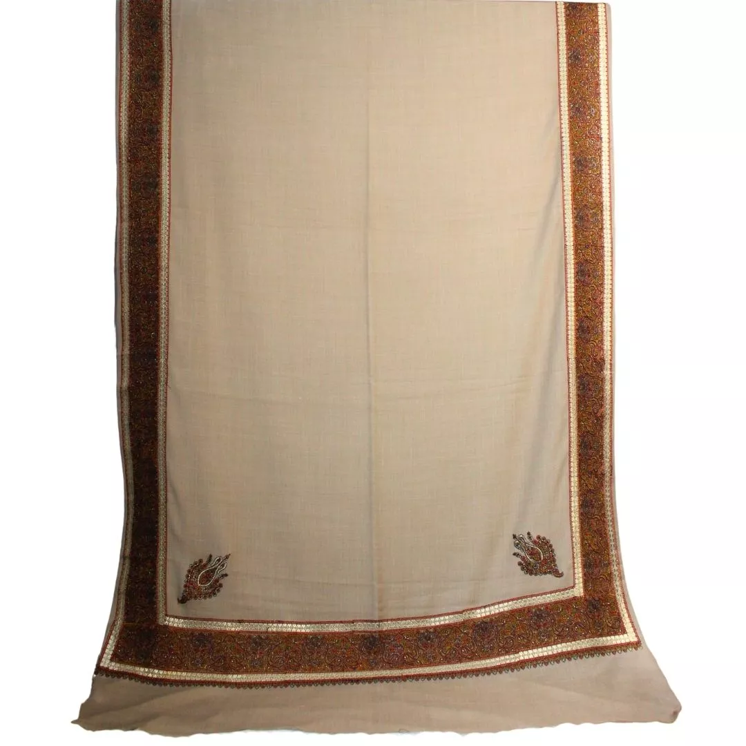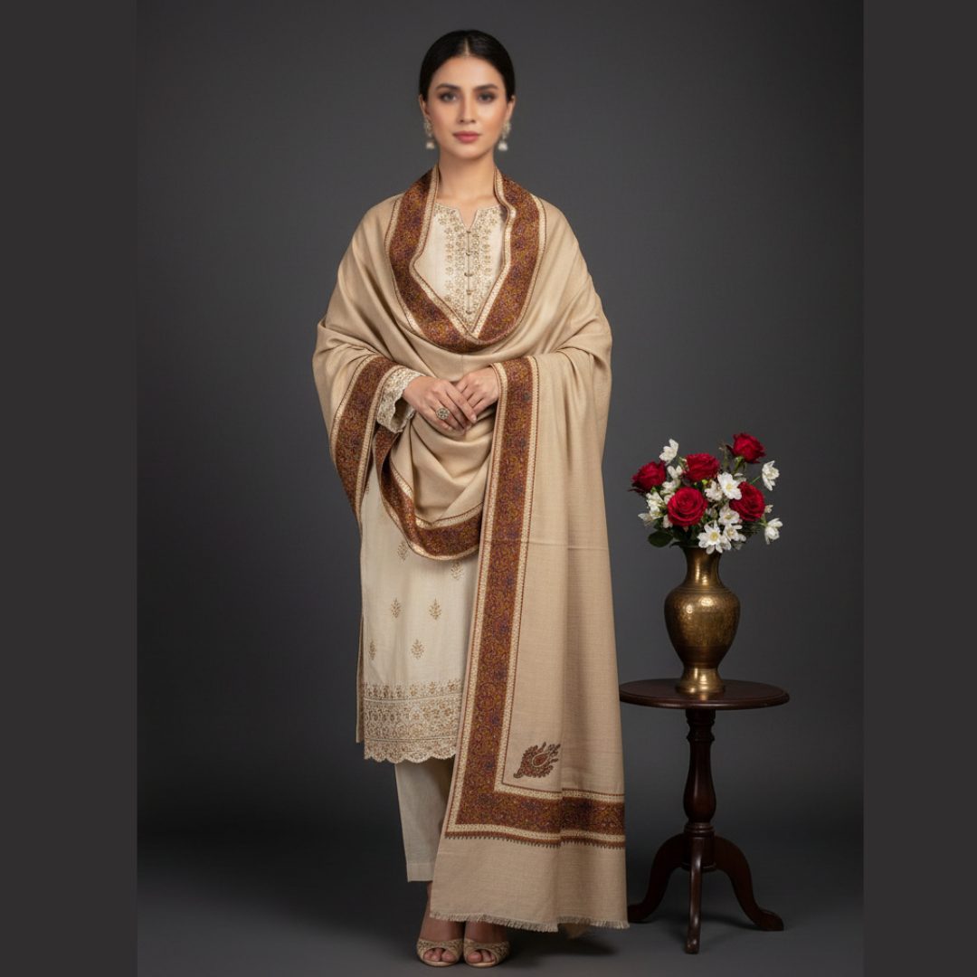 An elegant beige Pashmina Shawl bordered on all four sides with intricate embroidery, a timeless piece that whispers the grace of Kashmiri artistry.
