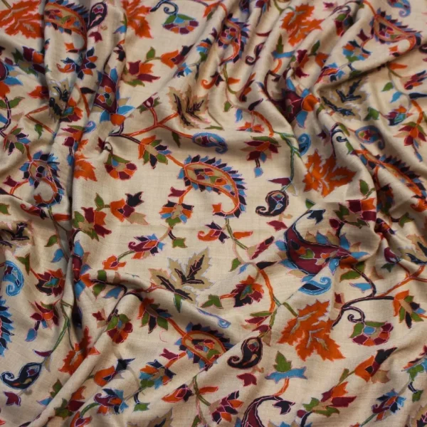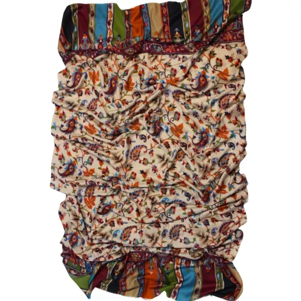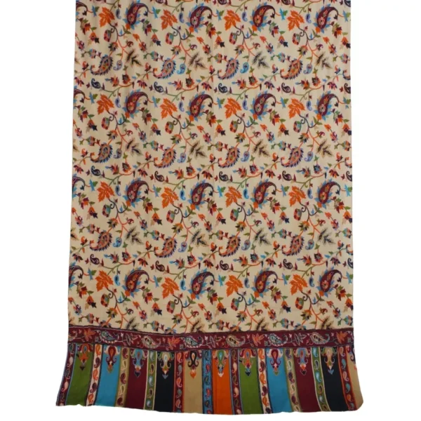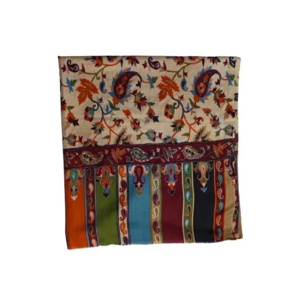 This hand-woven pashmina shawl features a serene beige base adorned with beautifully executed multi-color Qalam Kaar work, carefully rendered to create fluid, expressive patterns. Each detail reflects the precision and artistic depth of skilled women artisans, resulting in a shawl that feels vibrant yet refined. Crafted from premium pashmina, it is lightweight, breathable, and naturally warm, offering a graceful drape and luxurious comfort. Measuring 2.5 yards in length and 1.5 yards in width, this piece stands as a timeless expression of handcrafted heritage and artistic elegance.