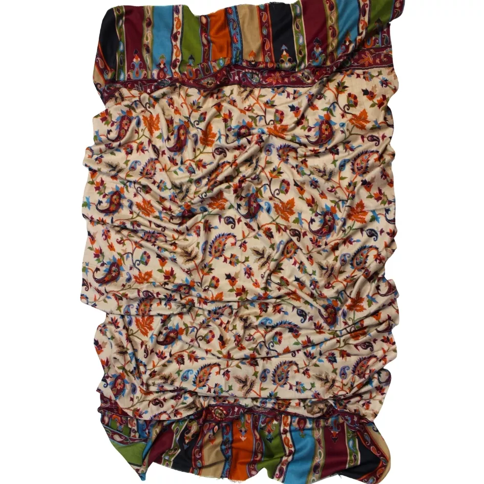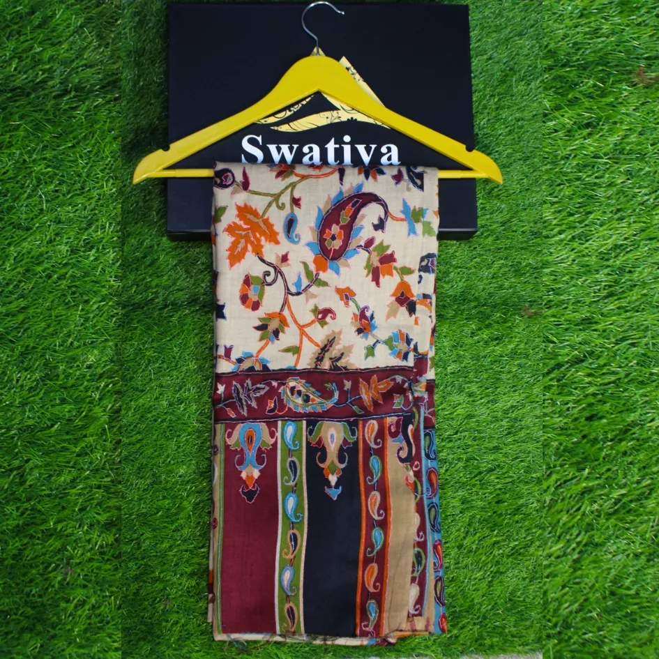 This hand-woven pashmina shawl features a serene beige base adorned with beautifully executed multi-color Qalam Kaar work, carefully rendered to create fluid, expressive patterns. Each detail reflects the precision and artistic depth of skilled women artisans, resulting in a shawl that feels vibrant yet refined. Crafted from premium pashmina, it is lightweight, breathable, and naturally warm, offering a graceful drape and luxurious comfort. Measuring 2.5 yards in length and 1.5 yards in width, this piece stands as a timeless expression of handcrafted heritage and artistic elegance.