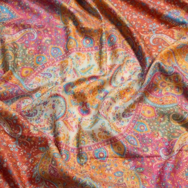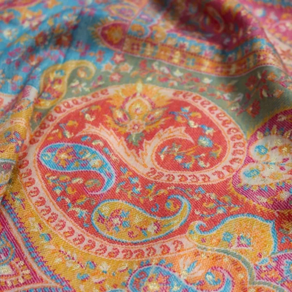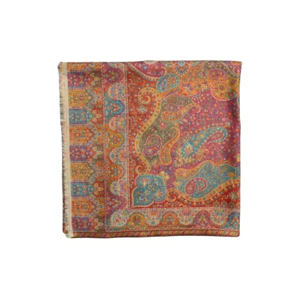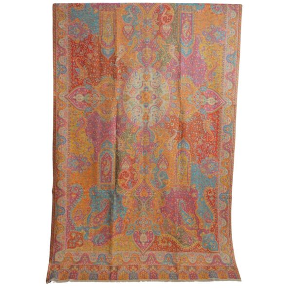 This hand-woven pashmina shawl is adorned with intricate multi-color Kaani weaving, a technique rooted in centuries of heritage artistry. Each pattern is meticulously woven by skilled artisans, creating a rich interplay of colors that feels both vibrant and refined. Crafted from premium pashmina, the shawl is lightweight, breathable, and naturally warm, offering an elegant drape with enduring comfort. Measuring 2.5 yards in length and 1.5 yards in width, this piece reflects patience, precision, and the beauty of slow craftsmanship. To maintain its elegance, dry clean only, store in breathable fabric, and protect from moisture and direct sunlight.