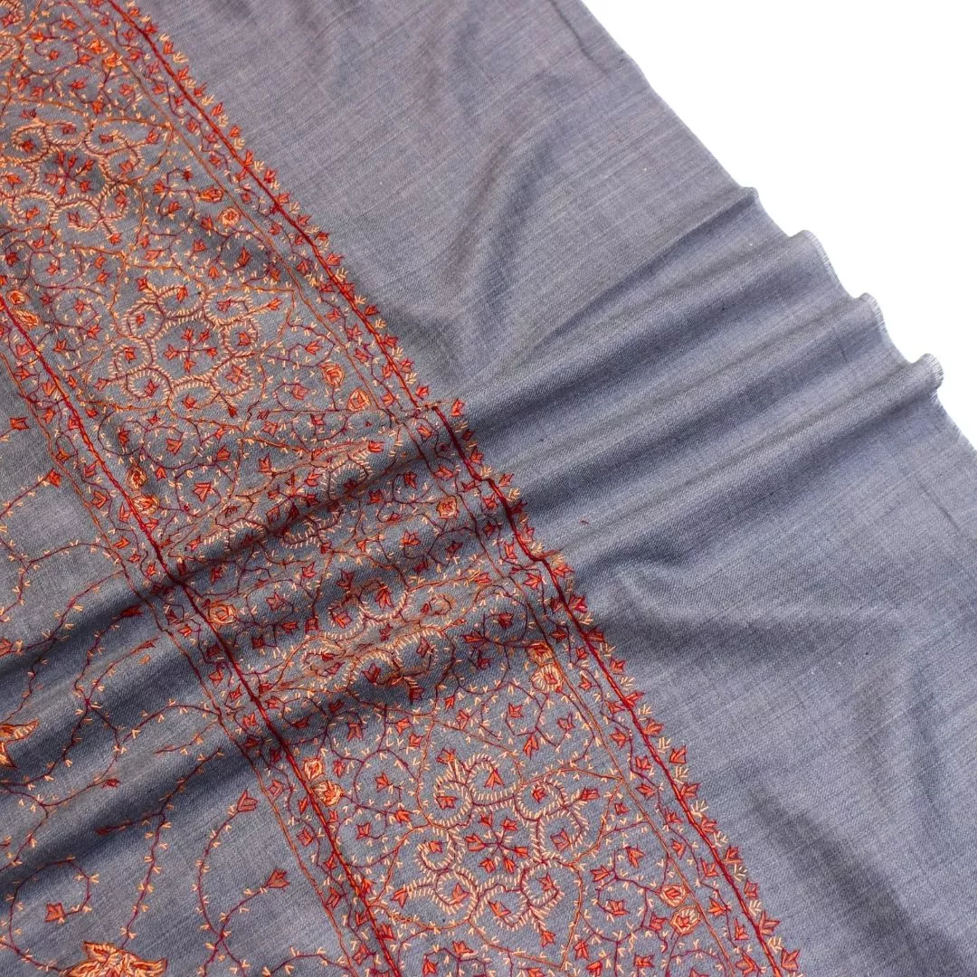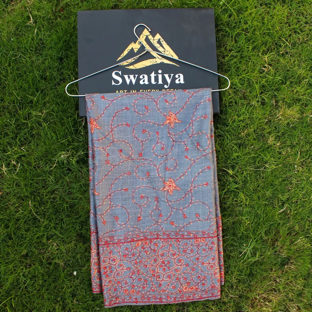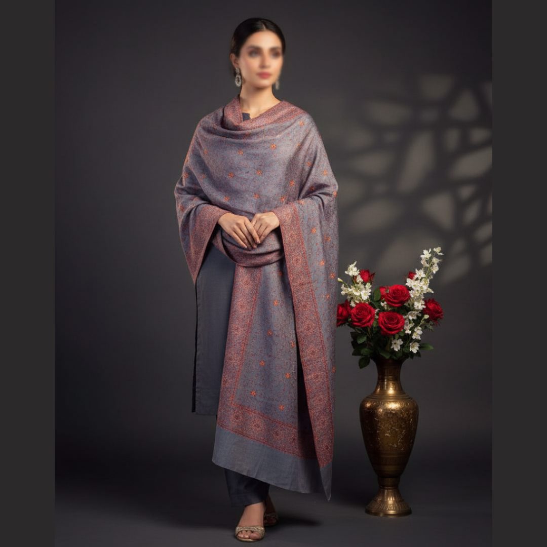 Gracefully crafted in the soothing shade of grey, this Pashmina Shawl embodies the calm of winter evenings and the luxury of Kashmiri artistry. Wrapped in fine handwoven pashmina, it features delicate sui embroidery, each stitch meticulously done by skilled women artisans.