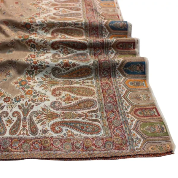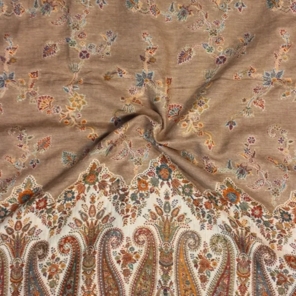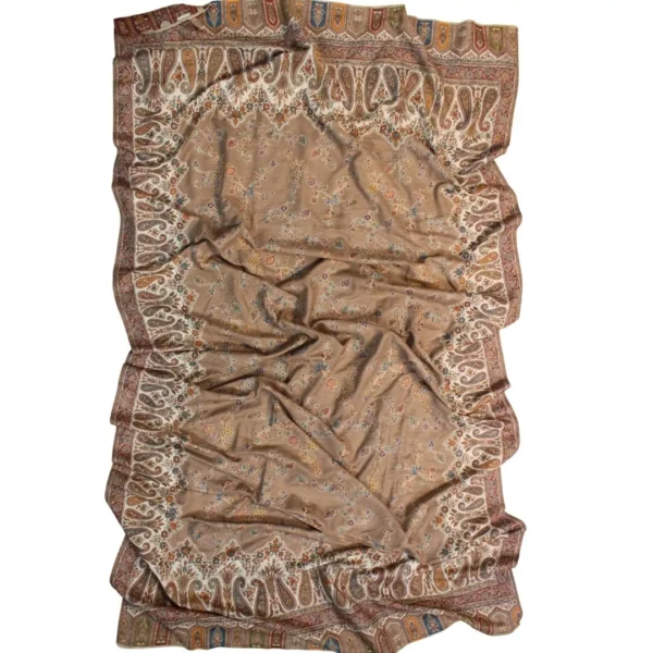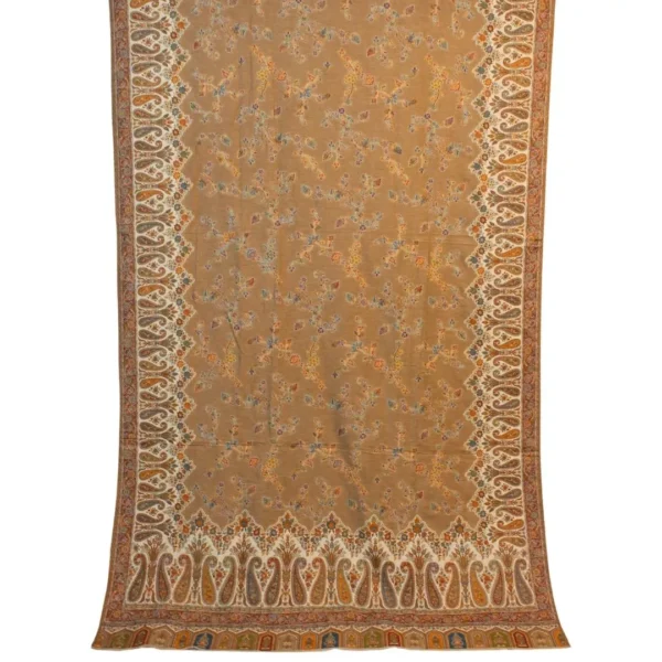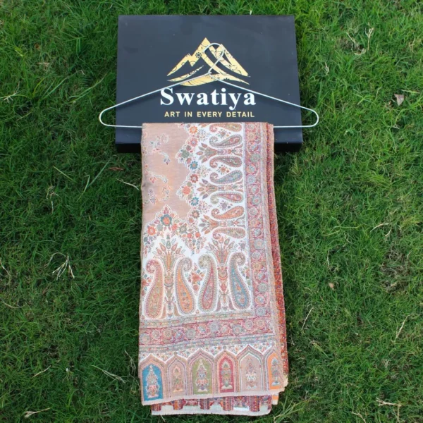 Ruh-e-Zameen – Pashmina Shawl embodies the connection between nature’s calm hues and human artistry. The earthy brown Pashmina base is beautifully detailed with traditional Kaani embroidery, a centuries-old Kashmiri craft known for its elegance and intricacy.