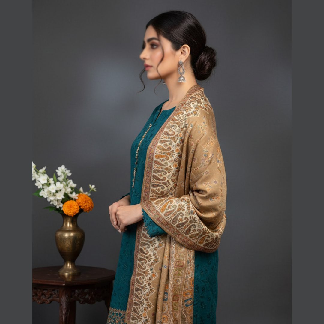 Ruh-e-Zameen – Pashmina Shawl embodies the connection between nature’s calm hues and human artistry. The earthy brown Pashmina base is beautifully detailed with traditional Kaani embroidery, a centuries-old Kashmiri craft known for its elegance and intricacy.