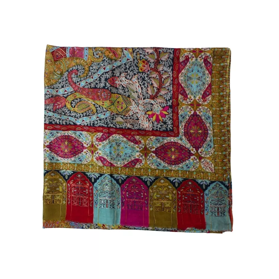 This Qalam Kaar shawl is created on a hand-painted fabric, following the traditional artistry where each brushstroke is applied by hand, allowing the colors to flow organically across the surface. The artwork is further enhanced with delicate hand embroidery, adding dimension, texture, and refined elegance to the design. Crafted by skilled women artisans, every shawl carries subtle variations that make it truly one of a kind. Lightweight, breathable, and graceful in movement, this piece reflects the harmony of painting and embroidery. Measuring 2.5 yards in length and 1.5 yards in width, it stands as a refined expression of heritage and wearable art.
