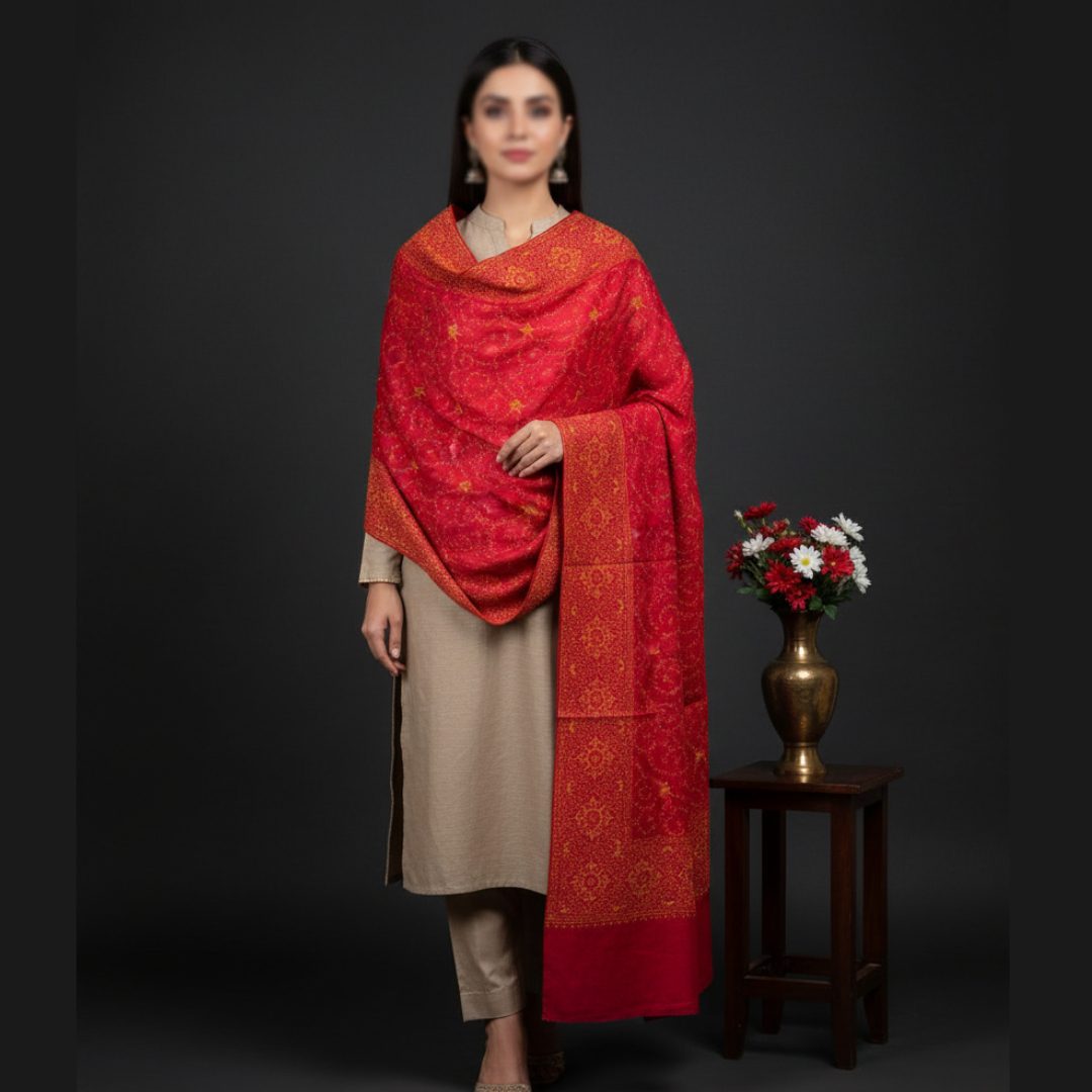 Woven from pure, soft, and breathable Pashmina, it drapes effortlessly — offering comfort, luxury, and tradition in perfect harmony. A timeless addition to any wardrobe, this shawl speaks the language of art, care, and heritage.