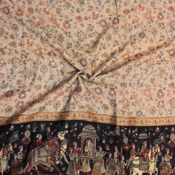 Shehr-e-Zar – Pashmina Shawl captures the warmth of heritage and the charm of refined artistry. With its soothing beige base bordered in deep black, the shawl showcases a delicate fusion of Kaani and Moonlight embroidery, a hallmark of Kashmiri craftsmanship that brings depth, rhythm, and grace to every fold.