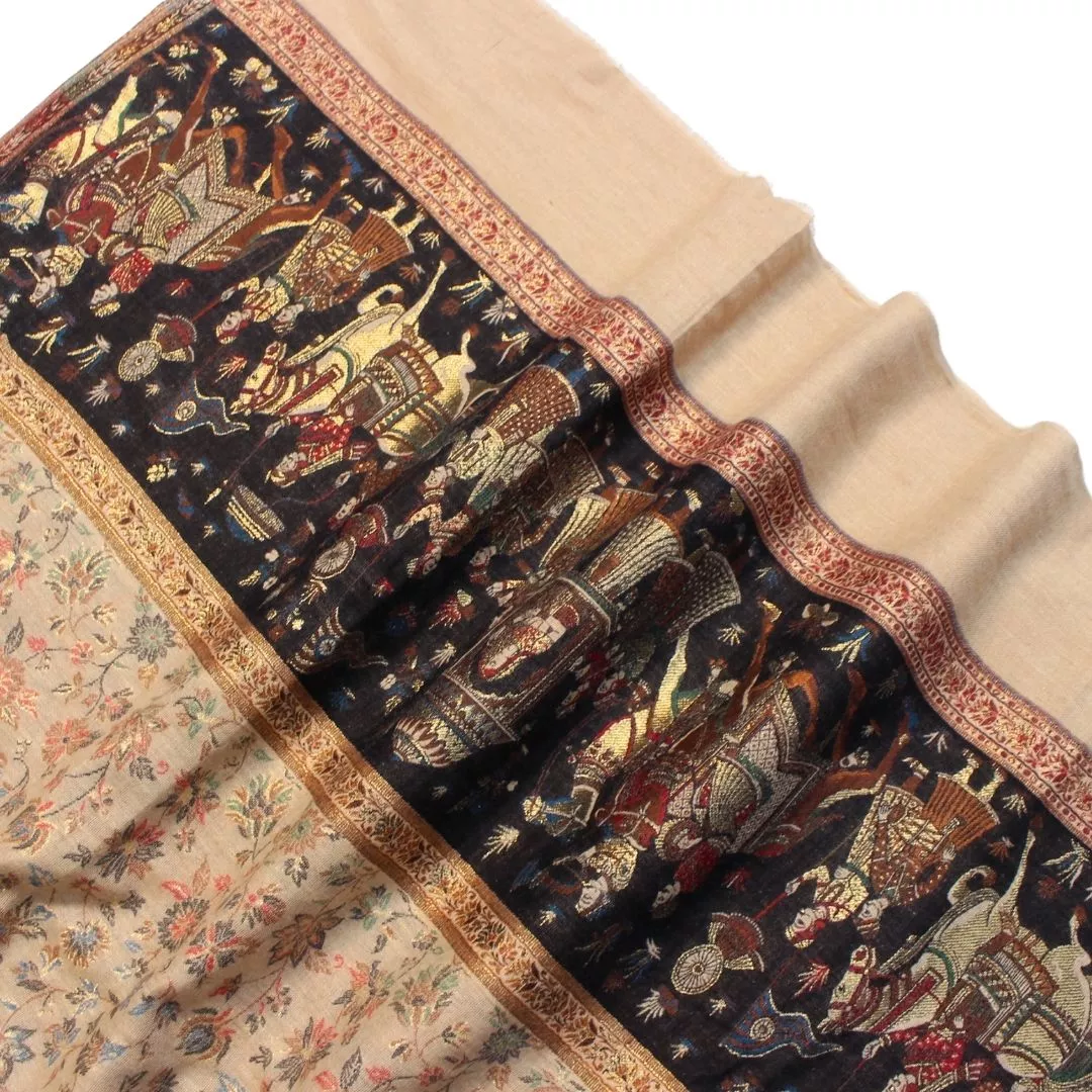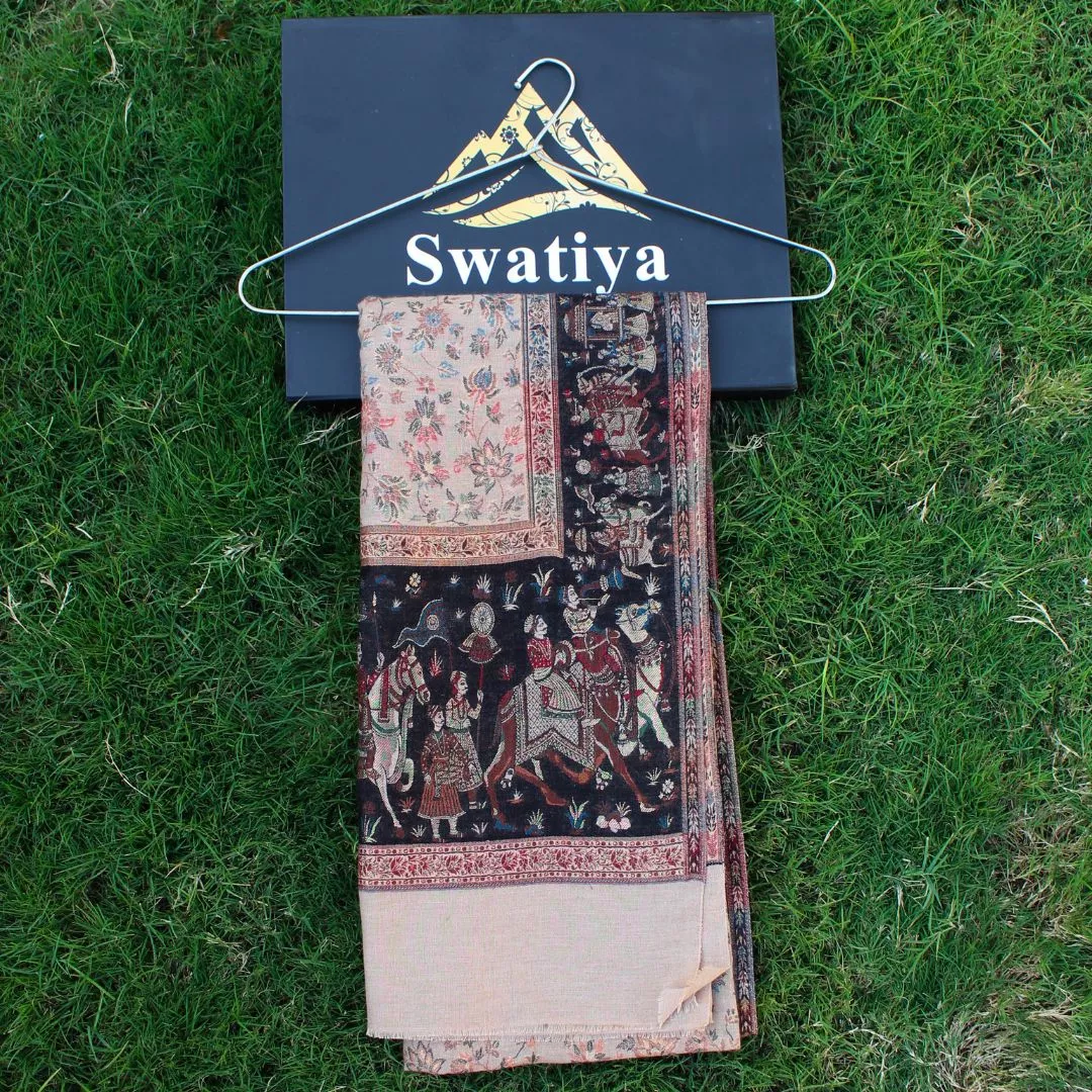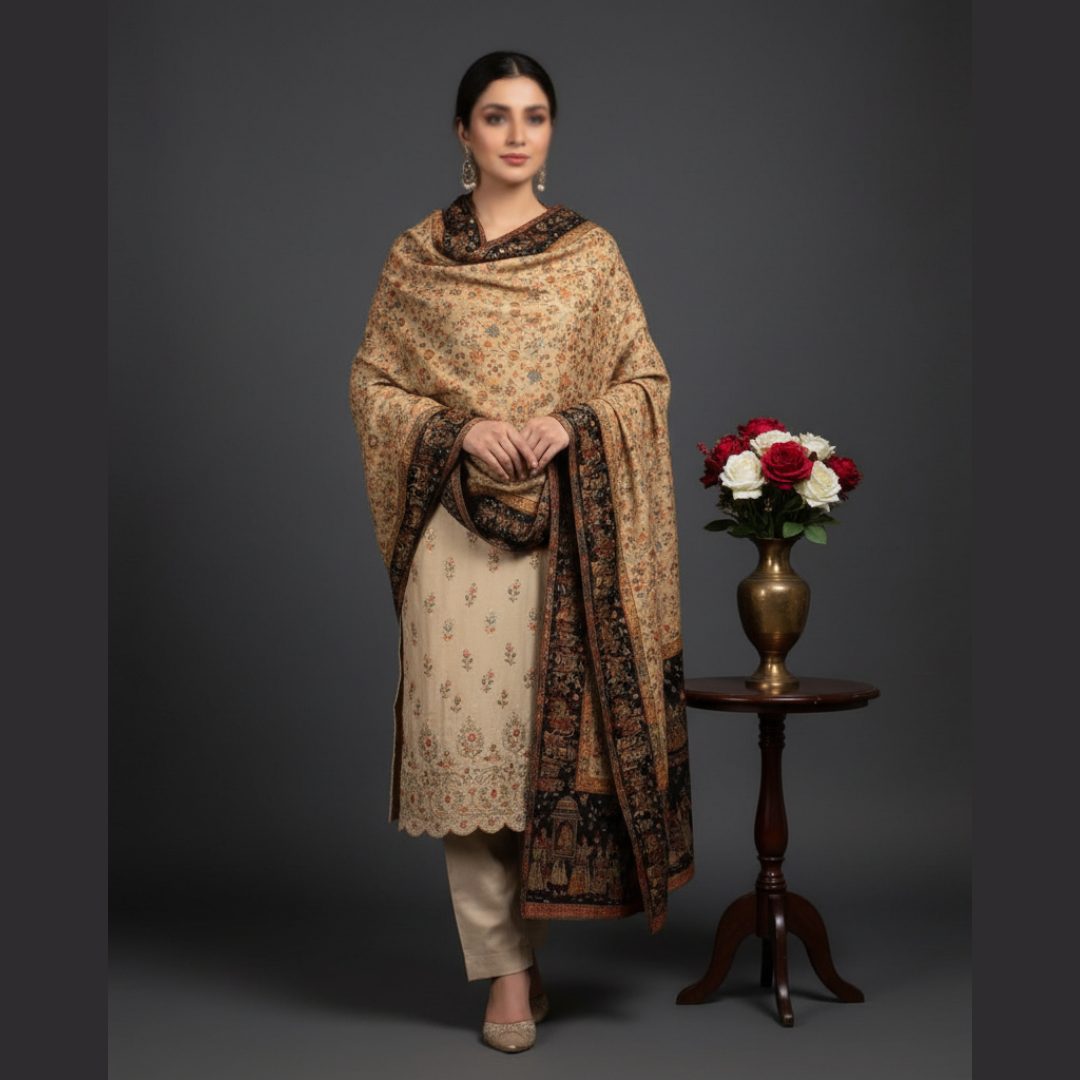 Shehr-e-Zar – Pashmina Shawl captures the warmth of heritage and the charm of refined artistry. With its soothing beige base bordered in deep black, the shawl showcases a delicate fusion of Kaani and Moonlight embroidery, a hallmark of Kashmiri craftsmanship that brings depth, rhythm, and grace to every fold.