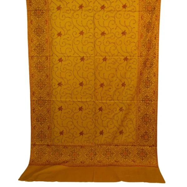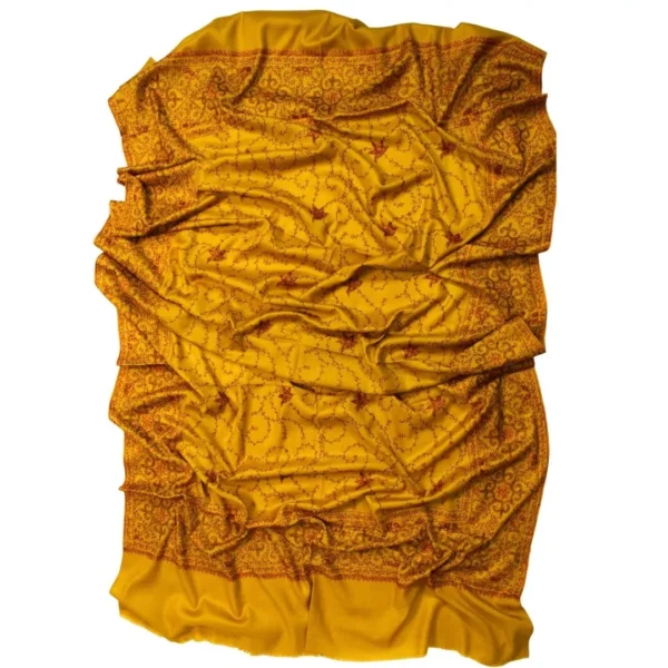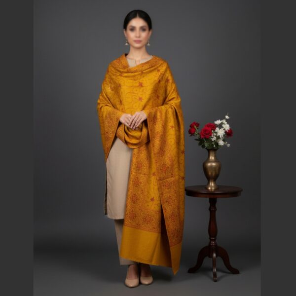 Shehr-e-Zard – Pashmina Shawl captures the golden charm of winter elegance. Woven in a rich mustard hue, it features graceful Sui embroidery — a delicate hand-stitched art form that adds intricate detail to every inch of this luxurious piece.