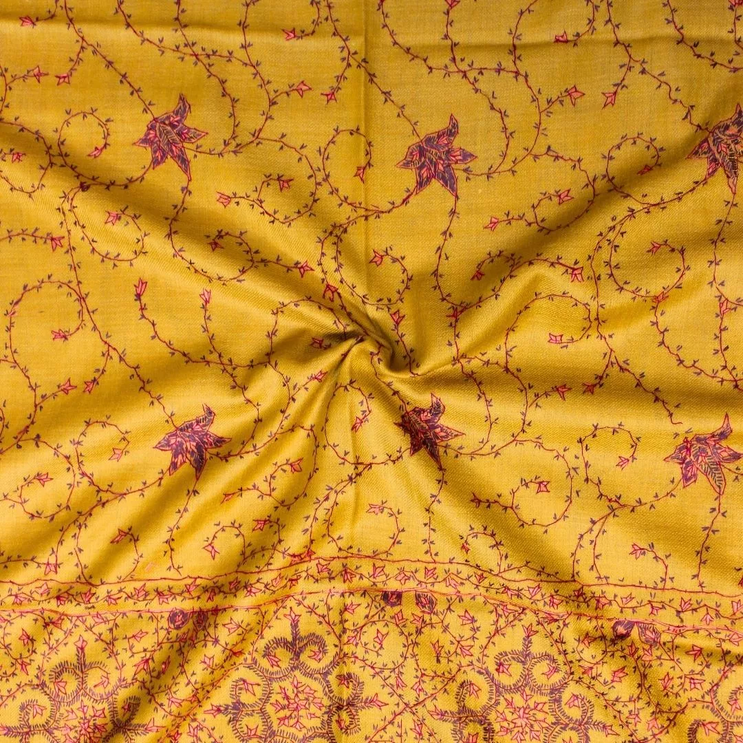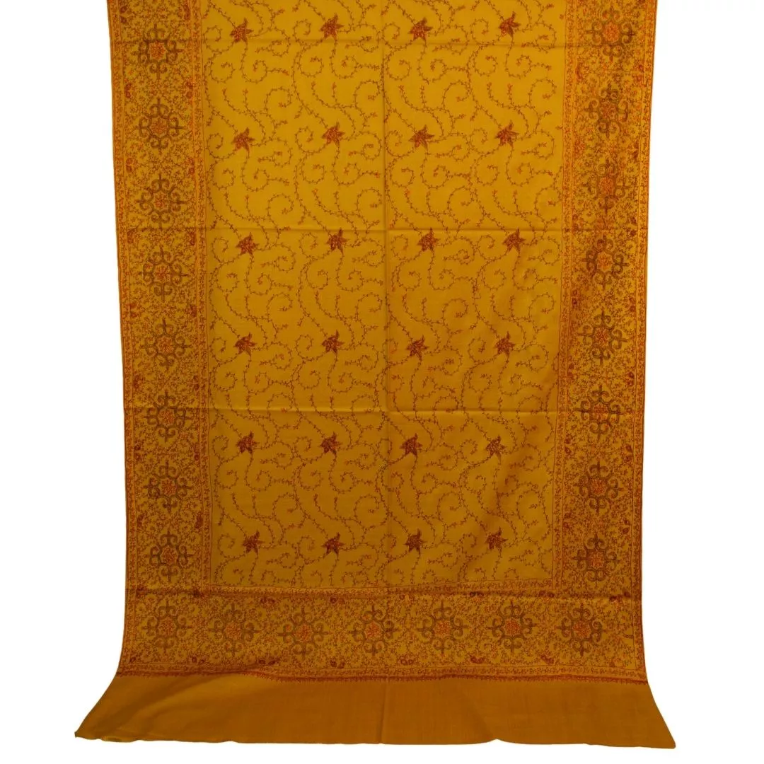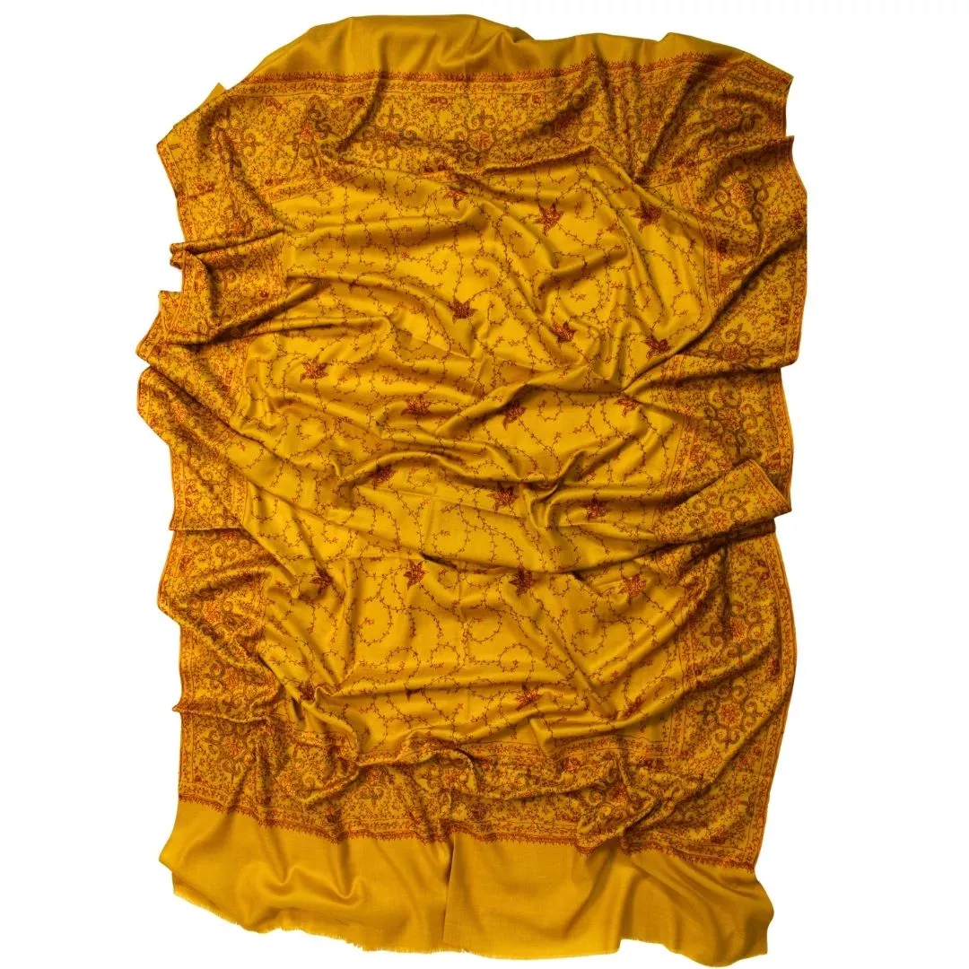 Shehr-e-Zard – Pashmina Shawl captures the golden charm of winter elegance. Woven in a rich mustard hue, it features graceful Sui embroidery — a delicate hand-stitched art form that adds intricate detail to every inch of this luxurious piece.