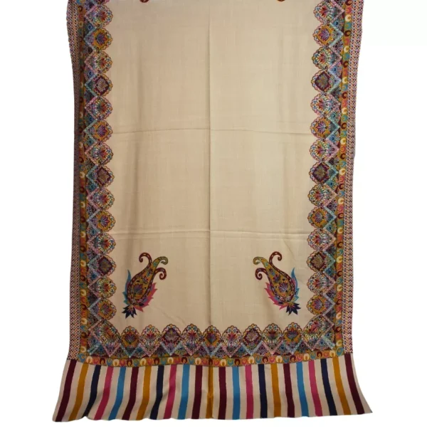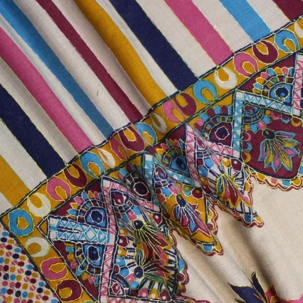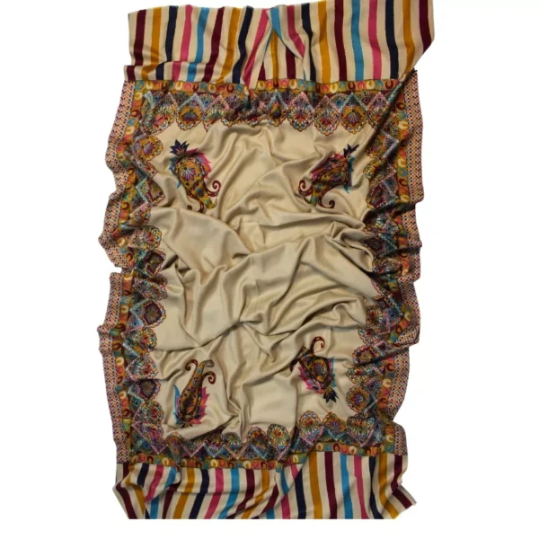 Crafted from pure hand-woven pashmina, this shawl features a graceful beige base adorned with intricate multi-color Qalam-Kaar work. Each motif is delicately hand-rendered by skilled artisans, reflecting a harmony of tradition and refined elegance. Lightweight yet naturally warm, the pashmina drapes effortlessly, making it a timeless expression of heritage craftsmanship. Sized at 2.5 yards in length and 1.5 yards in width, this piece embodies patience, artistry, and quiet luxury. To preserve its beauty, dry clean only, store in breathable fabric, and avoid moisture and direct sunlight.
